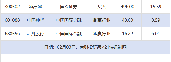 首次覆盖方面,2月3日券商共给出了7次首次覆盖,其中中国巨石获得国联民生证券给予“推荐”评级,欧莱新材获得东北证券给予“增持”评级,环旭电子获得甬兴证券给予“买入”评级,长白山获得华源证券给予“增持”评级,江西铜业获得开源证券给予“买入”评级。