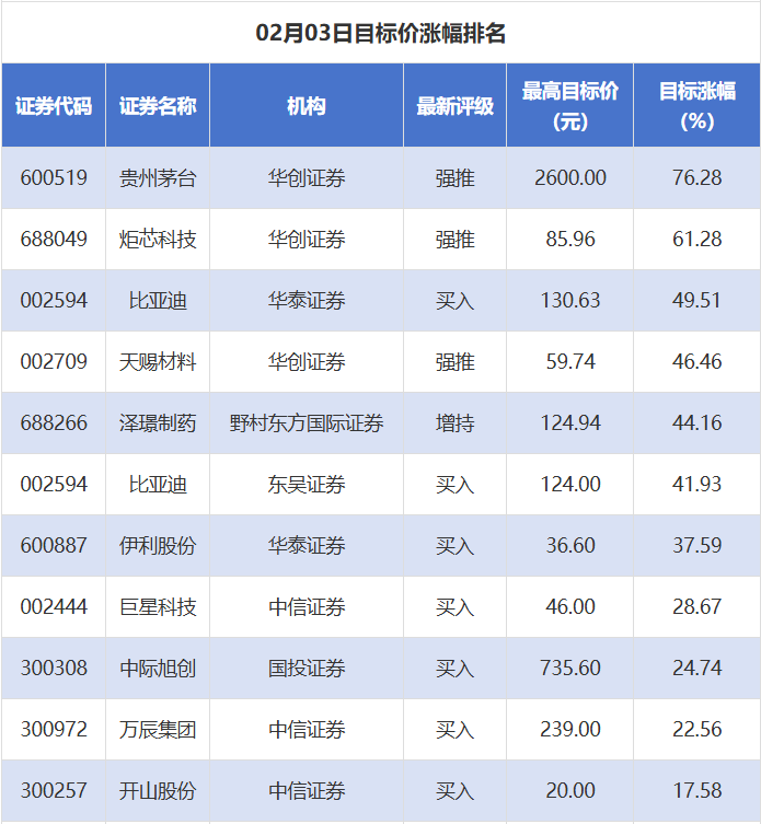 南财投研通数据显示,2月3日,券商给予上市公司目标价共14次,按最新收盘价计算,目标价涨幅排名居前的公司有贵州茅台、炬芯科技、比亚迪,目标价涨幅分别为76.28%、61.28%、49.51%,分别属于白酒、半导体、乘用车行业。