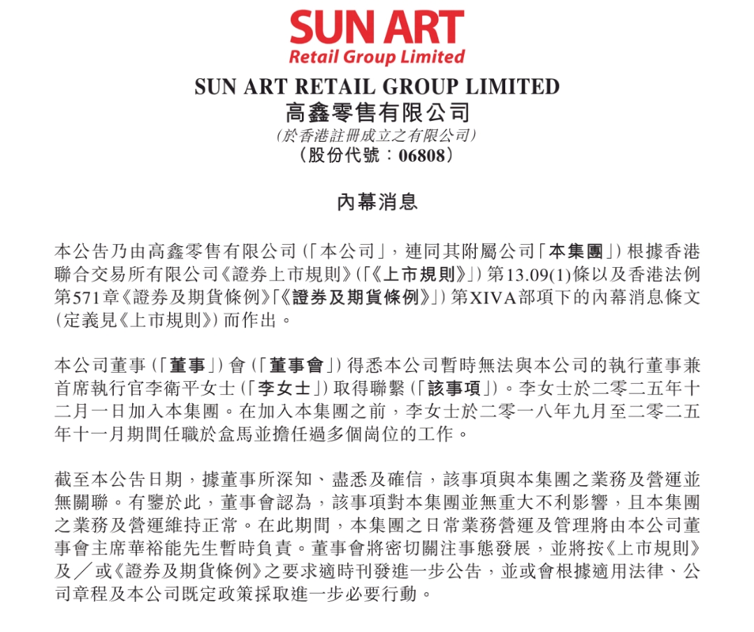 据高鑫零售公告,截至目前,公司暂时无法与李卫平取得联系。当前,公司各项经营活动正常有序推进,年货销售旺季相关工作稳步开展,商品供应、服务保障等均未受到影响。为确保公司运营的稳定性与连续性,目前相关经营管理工作已由高鑫零售董事会主席华裕能先生统筹代管,四大区区总和集团高管紧密协同配合,全面保障各项管理工作平稳落地、业务有序推进。