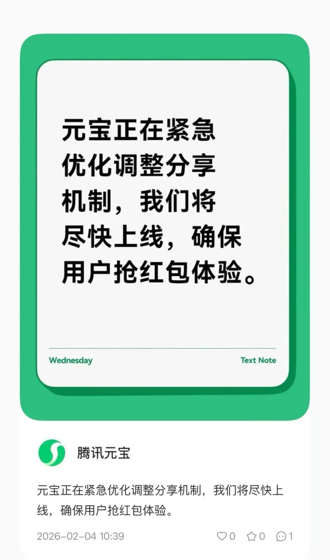 元宝对此回应称,正在紧急优化调整分享机制,将尽快上线,确保用户抢红包体验。
