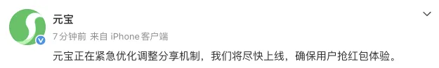 今日(2月4日),元宝回应被微信屏蔽:正在紧急优化调整分享机制,我们将尽快上线,确保用户抢红包体验。