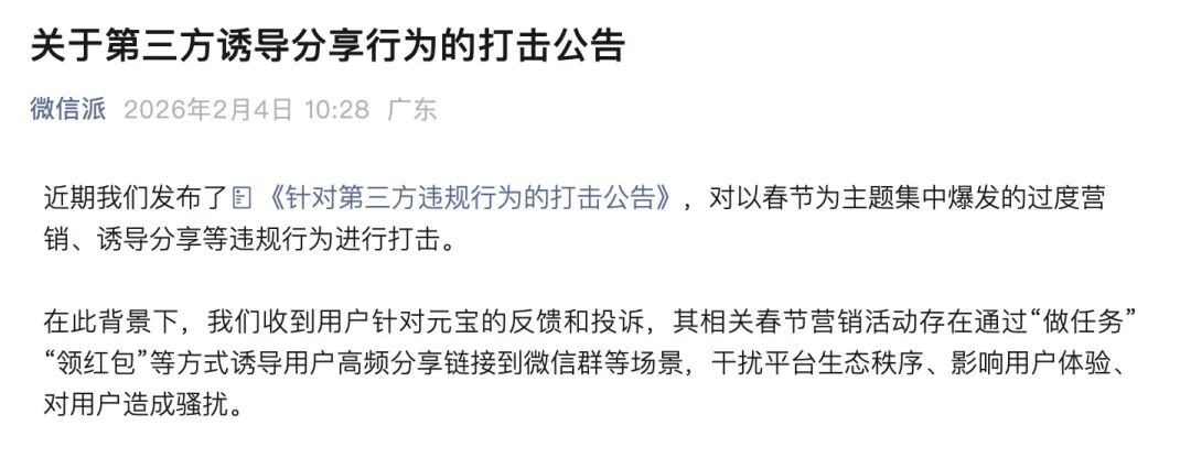 微信官方账号“微信派”发布消息回应称,其近期发布了《针对第三方违规行为的打击公告》,对以春节为主题集中爆发的过度营销、诱导分享等违规行为进行打击,微信收到用户针对元宝的反馈和投诉,其相关春节营销活动存在通过“做任务”“领红包”等方式诱导用户高频分享链接到微信群等场景,干扰平台生态秩序、影响用户体验、对用户造成骚扰。