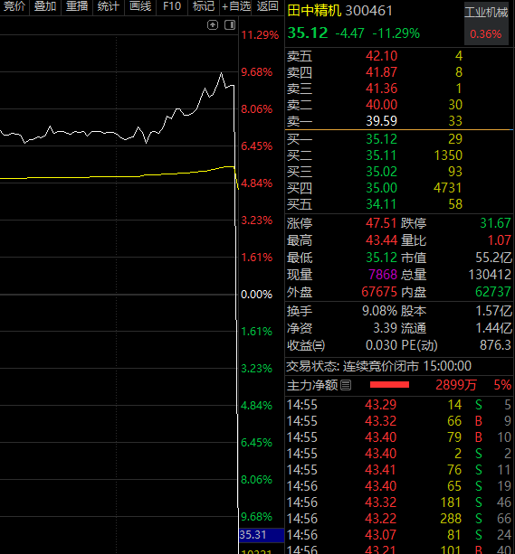 田中精机(300461)尾盘惊现大跳水,竞价交易最后阶段价格为43.19元,涨幅超9%,集合竞价暴跌至35.12元,跌幅超11%。也就是说,从竞价交易到集合竞价该股累计暴跌近19%。