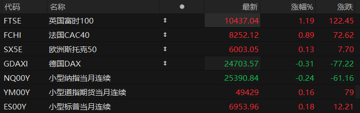 周五盘前,美股三大股指期货涨跌不一,欧洲主要指数多数上涨。截至发稿,纳斯达克100指数期货跌0.24%,道指期货涨0.16%,标普500指数期货涨0.18%。