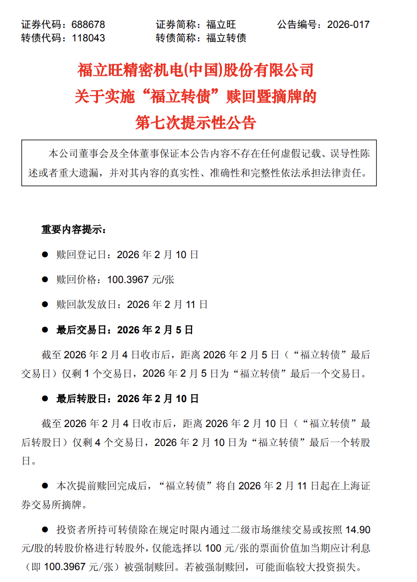 2月4日,福立旺发布关于实施“福立转债”赎回暨摘牌的第七次提示性公告,提醒投资者2月5日为福立转债最后一个交易日,2月10日是最后一个转股日,债券持有人应及时卖出或转股。2月10日收市后,未实施转股的福立转债将全部冻结,停止交易和转股。