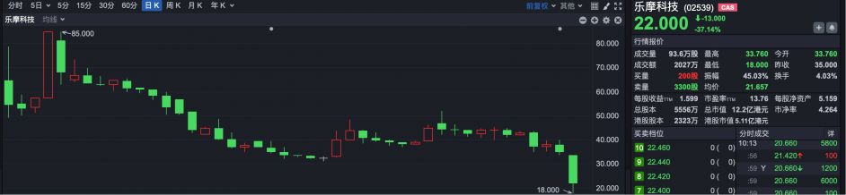去年12月3日,乐摩科技在港交所上市。而在上市前的暗盘交易阶段,乐摩科技备受追捧,上市首日也高开60%。去年12月8日,乐摩科技更是大涨47%,股价突破80港元,较40港元发行价实现翻倍。