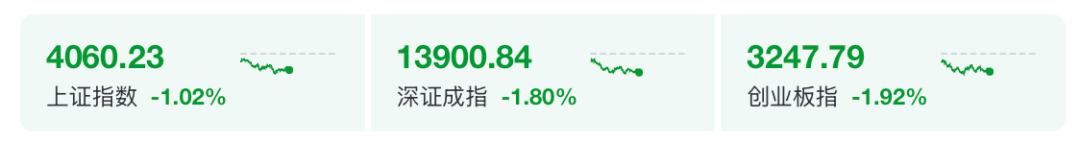 截至午间收盘,沪指跌1.02%,深证成指跌1.8%,创业板指跌1.92%。