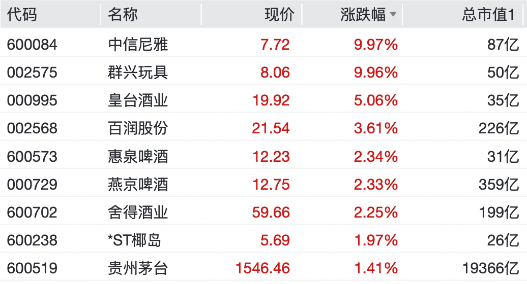 贵州茅台涨1.41%,现报1546.46元/股,最新市值增至19366亿元。中信尼雅、群兴玩具均录得10cm涨停,皇台酒业、百润股份、燕京啤酒、舍得酒业等个股纷纷上涨。