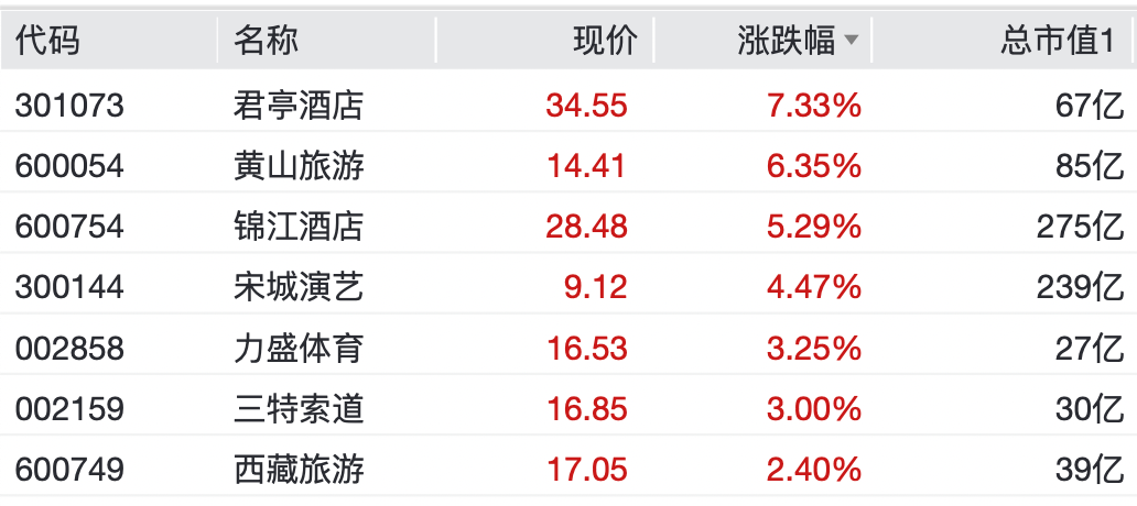 餐饮旅游方面,君亭酒店涨超7%,黄山旅游涨超6%,锦江酒店、宋城演艺、力盛体育、西藏旅游等跟涨。