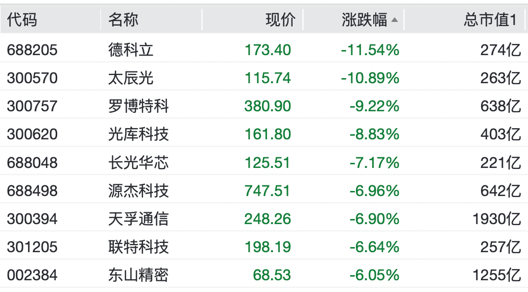 光模块概念股下挫,德科立、太辰光跌超10%,罗博特科、光库科技、长光华芯跌超7%;中际旭创则逆市上涨,截至收盘涨0.89%。