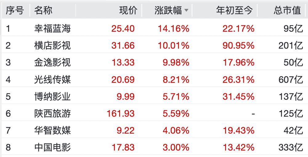 浙文影业、金逸影视均涨停,幸福蓝海涨超14%,光线传媒涨超8%,天威视讯、宋城演艺、天下秀等跟涨。
