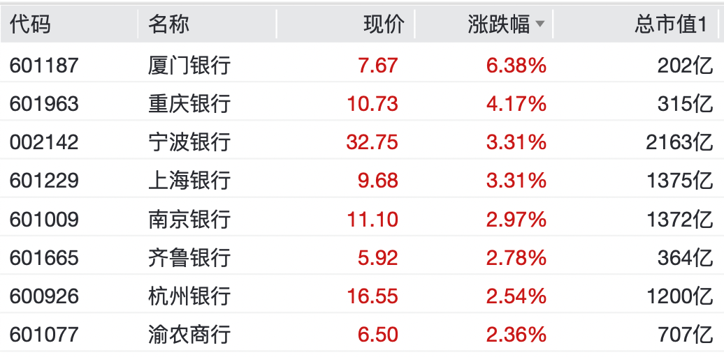 厦门银行涨超6%,重庆银行涨超4%,宁波银行、上海银行、南京银行、齐鲁银行、杭州银行等均涨超2%。