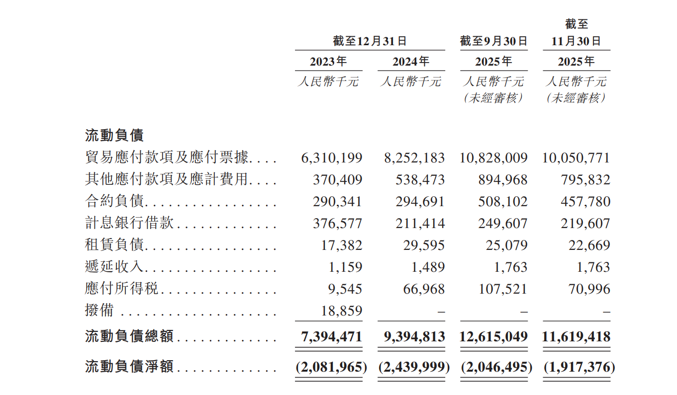 台铃科技的负债主要来自贸易应付款项及应付票据,即经营负债。2024年年末,公司贸易应付款项及应付票据为82.5亿元,2025年11月末破百亿达到100.5亿元。