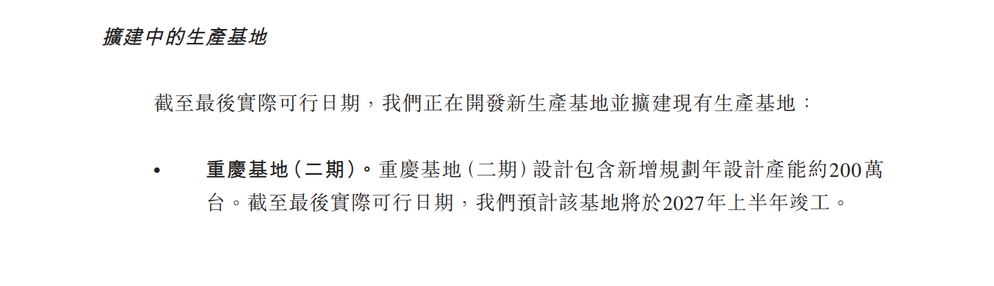 预计2026年上半年竣工的约600万台产能的天津基地(二期);2027年上半年竣工的约90万台产能的新越南基地。