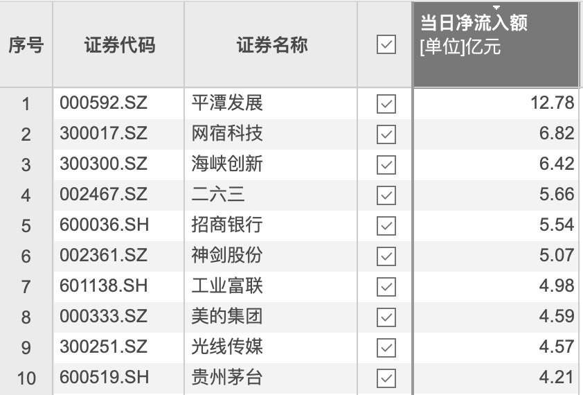 上证报中国证券网讯 Choice数据显示,2月5日,资金净流入额排名前十的个股依次是平潭发展、网宿科技、海峡创新、二六三、招商银行、神剑股份、工业富联、美的集团、光线传媒、贵州茅台。其中,平潭发展获净流入12.78亿元。