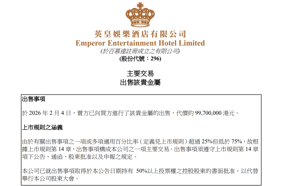 2月4日晚间,港股上市公司英皇娱乐酒店(00296.HK)公告确认,这批总重超过79公斤的黄金已被出售,售价约9970万港元。