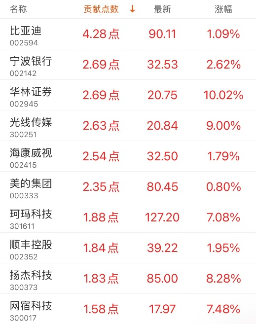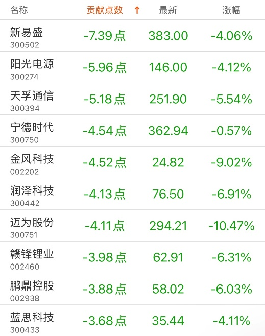 对深证成指贡献点数最多的个股是比亚迪,贡献4.28点,该股当日涨1.09%,收盘价90.11元;拖累点数最多的个股是新易盛,拖累7.39点,该股当日跌4.06%,收盘价383元。