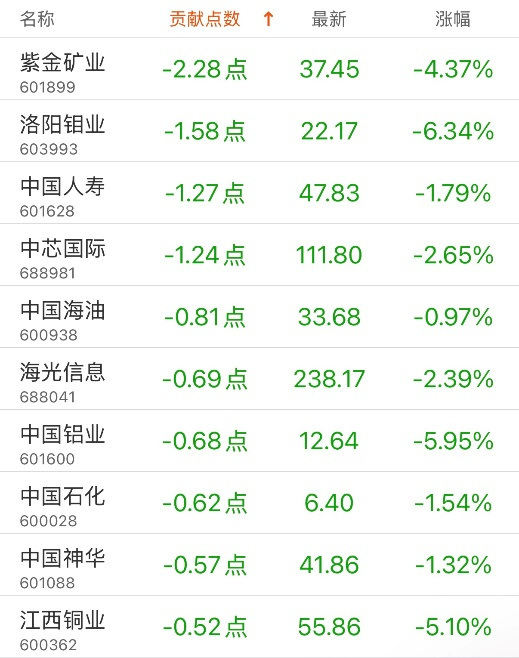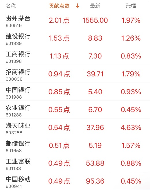 对上证指数贡献点数最多的个股是贵州茅台,贡献2.01点,该股当日涨1.97%,收盘价1555元;拖累点数最多的个股是紫金矿业,拖累2.28点,该股当日跌4.37%,收盘价37.45元。