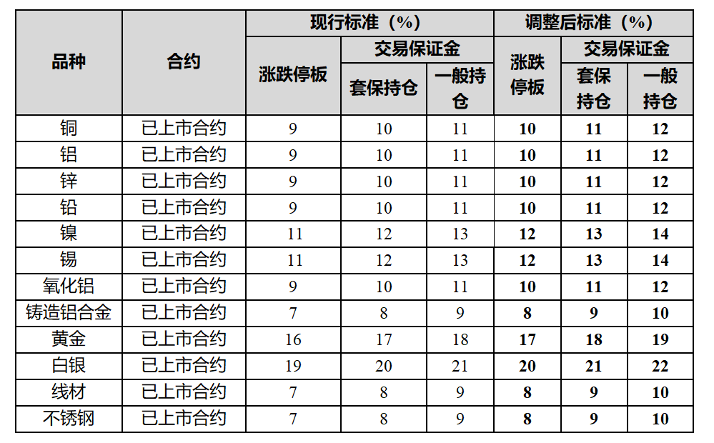 铜、铝、铅、锌、氧化铝期货已上市合约的涨跌停板幅度调整为10%,套保持仓交易保证金比例调整为11%,一般持仓交易保证金比例调整为12%;