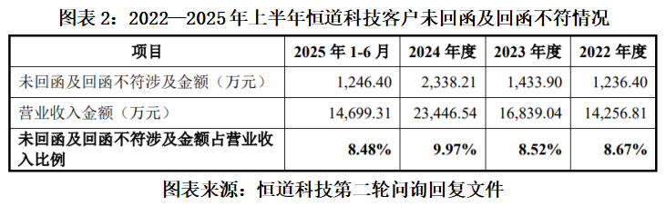 第一轮问询回复文件显示,报告期各期,中介机构对恒道科技客户发函数量的比例分别为31.69%、29.18%、19.07%、27.29%。其中,对销售额50万元以下客户发函数量比例分别为21.95%、19.30%、5.72%、17.80%。从数量上看,报告期各期,未收到函的客户数量分别为429家、483家、628家、437家,其中,销售额50万元以下客户未收到函的数量分别为427家、481家、626家、434家。