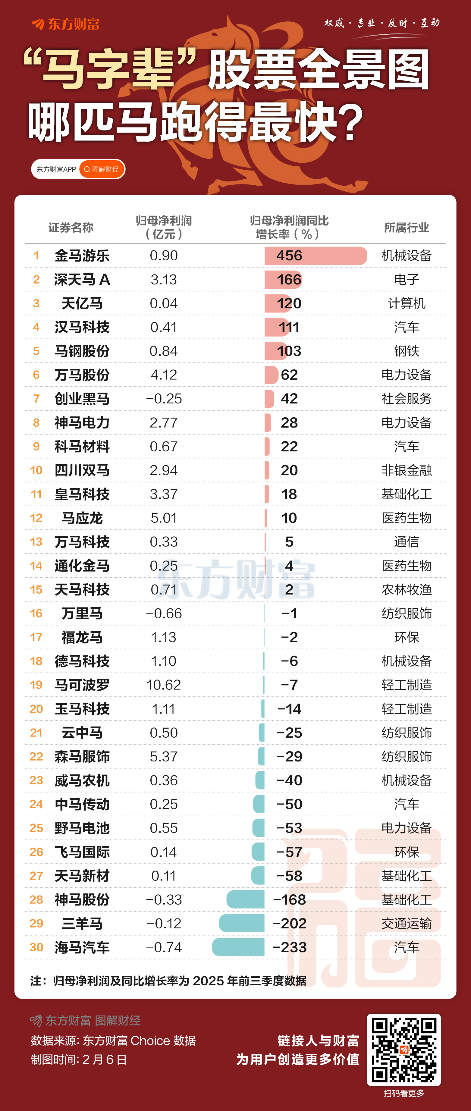 从归母净利润增速来看,金马游乐实现断崖式领先,前三季度归母净利润同比增长456%。此外,还有4只股票前三季度归母净利润增长超100%,分别是深天马A(166%)、天亿马(120%)、汉马科技(111%)和马钢股份(103%)。而从整体来看,有一半“马字辈”股票前三季度归母净利润增速为正。