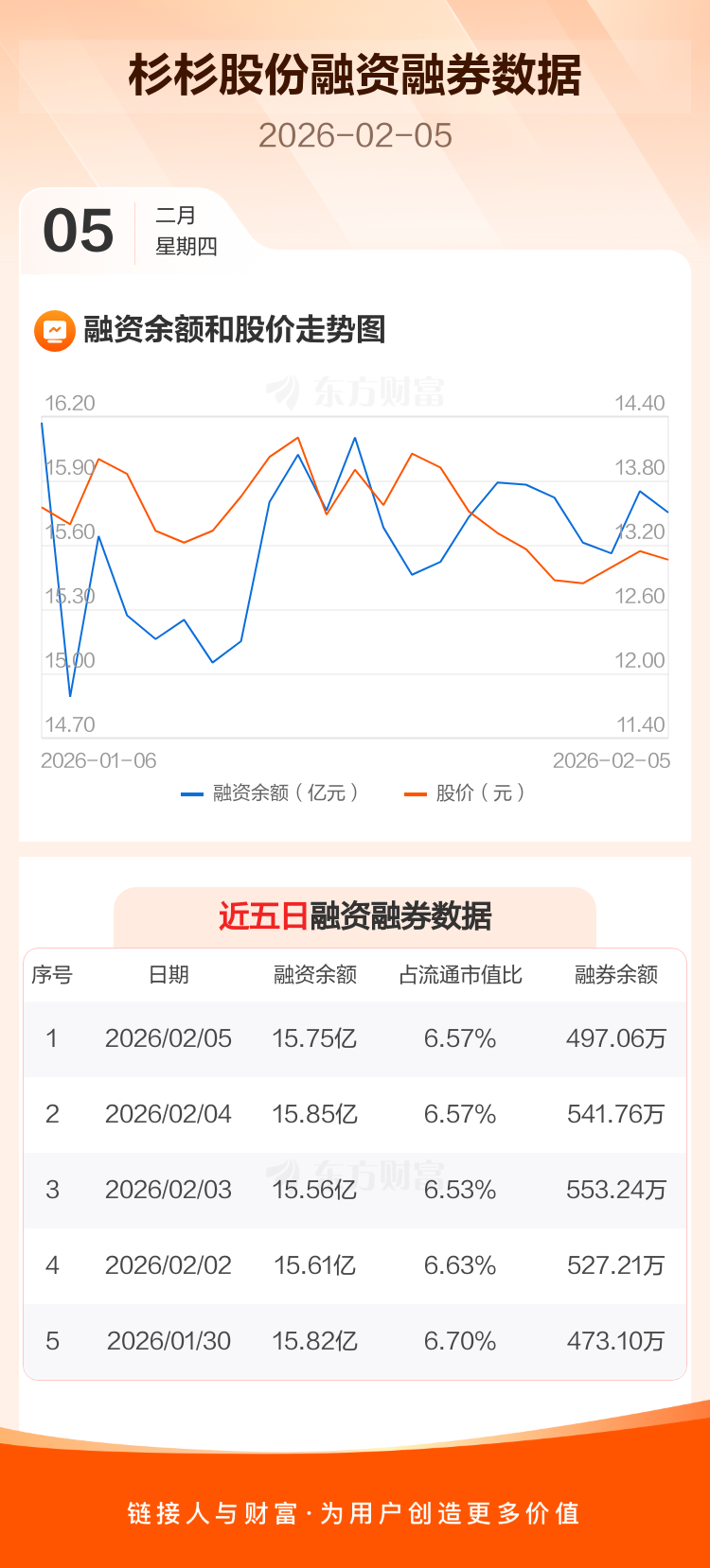 交易所最新数据显示,杉杉股份于2026年2月5日获融资买入3082.66万元,融资偿还4152.88万元,当日融资净偿还1070.22万元。目前,该股融资余额15.75亿,占流通市值比例为6.57%。
