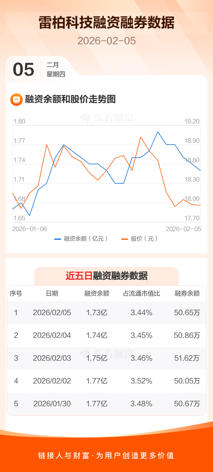交易所最新数据显示,雷柏科技于2026年2月5日获融资买入306.88万元,融资偿还363.43万元,当日融资净偿还56.55万元。目前,该股融资余额1.73亿,占流通市值比例为3.44%。