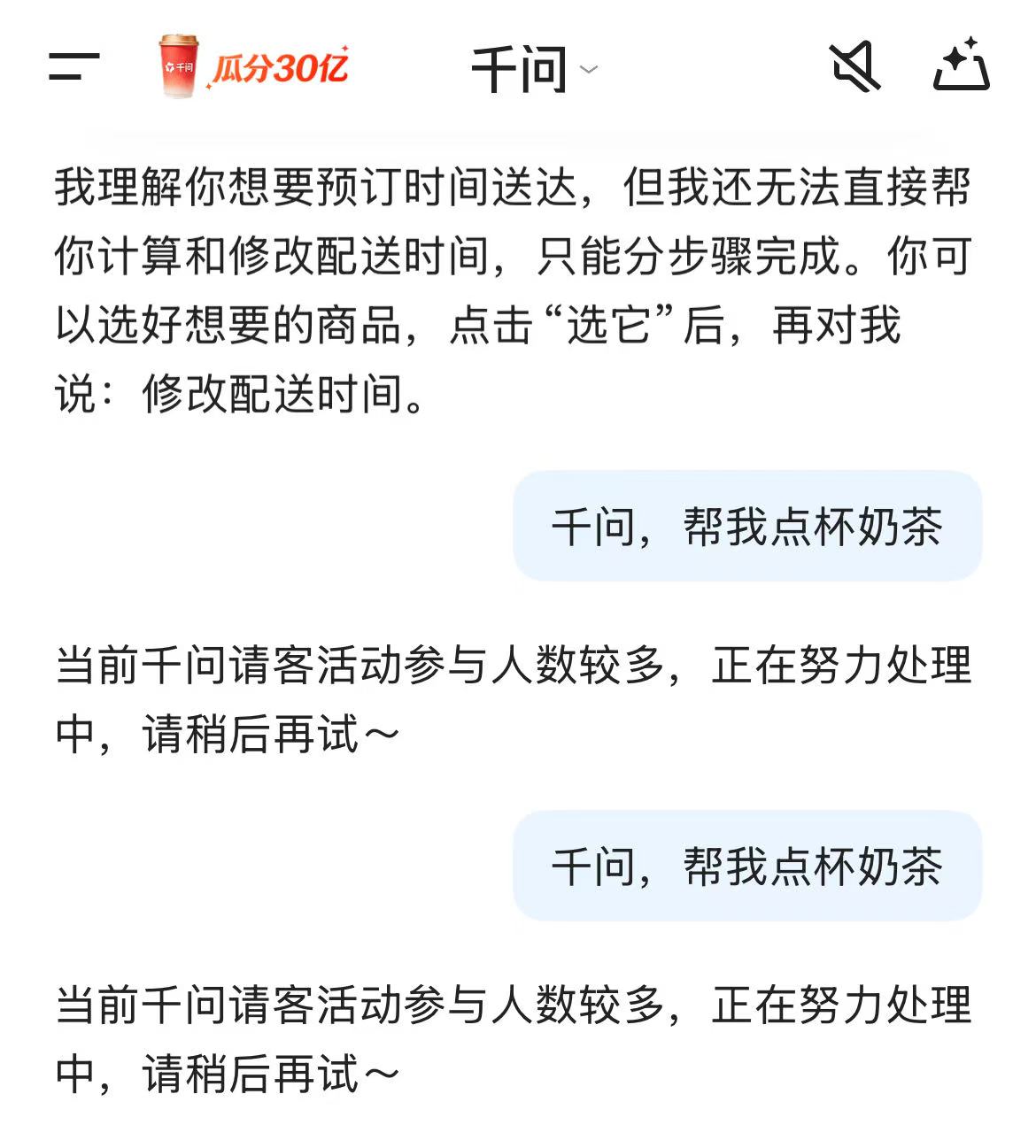 活动上线后,不少网友反馈,千问明显出现卡顿,页面信息显示“当前千问请客活动参与人数较多,正在努力处理中,请稍后再试”。