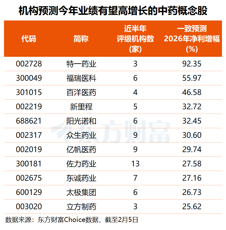 根据三家及以上机构一致预测(不含2025年预亏股),特一药业2026年净利有望同比增长近一倍,福瑞医科、百洋医药今年净利增幅将分别达55.97%和46.58%,新里程、阳光诺和、众生药业均有望实现30%以上的业绩增长。