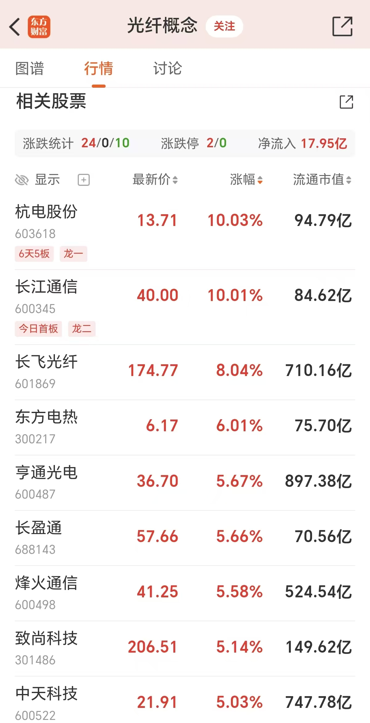 周五,光纤概念爆发,杭电股份、长江通信等涨停,长飞光纤、亨通光电等跟涨。