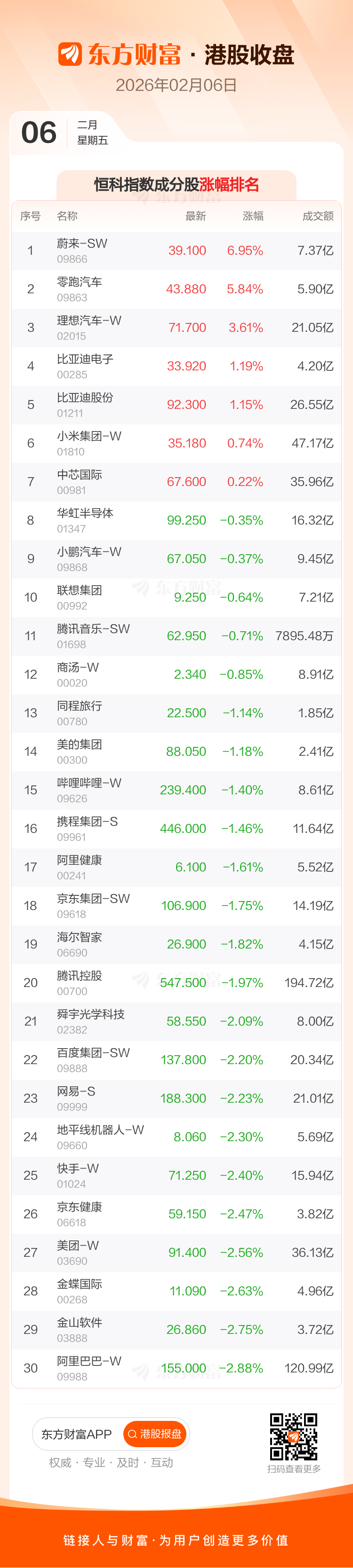 2月6日港股收盘:恒指跌1.21% 恒生科技指数跌1.11%