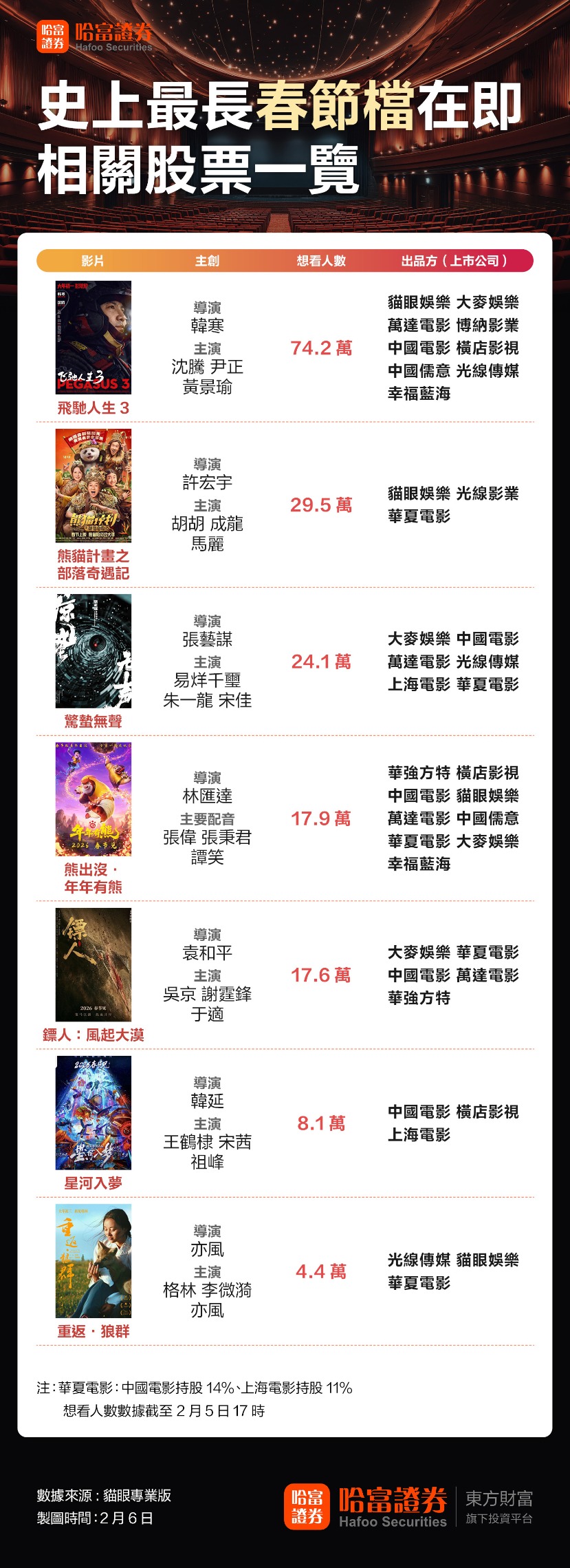 猫眼专业版影片信息显示,多家上市公司为上述影片的出品及联合出品方。《飞驰人生3》的出品方有猫眼娱乐、大麦娱乐、万达电影、博纳影业等9家上市公司,《熊出没·年年有熊》的出品方同样较多,有华强方特、横店影视、中国电影、猫眼娱乐、万达电影等。总的来看,中国电影参与出品最多(算上华夏电影:中国电影持股14%),包含所有7部影片。