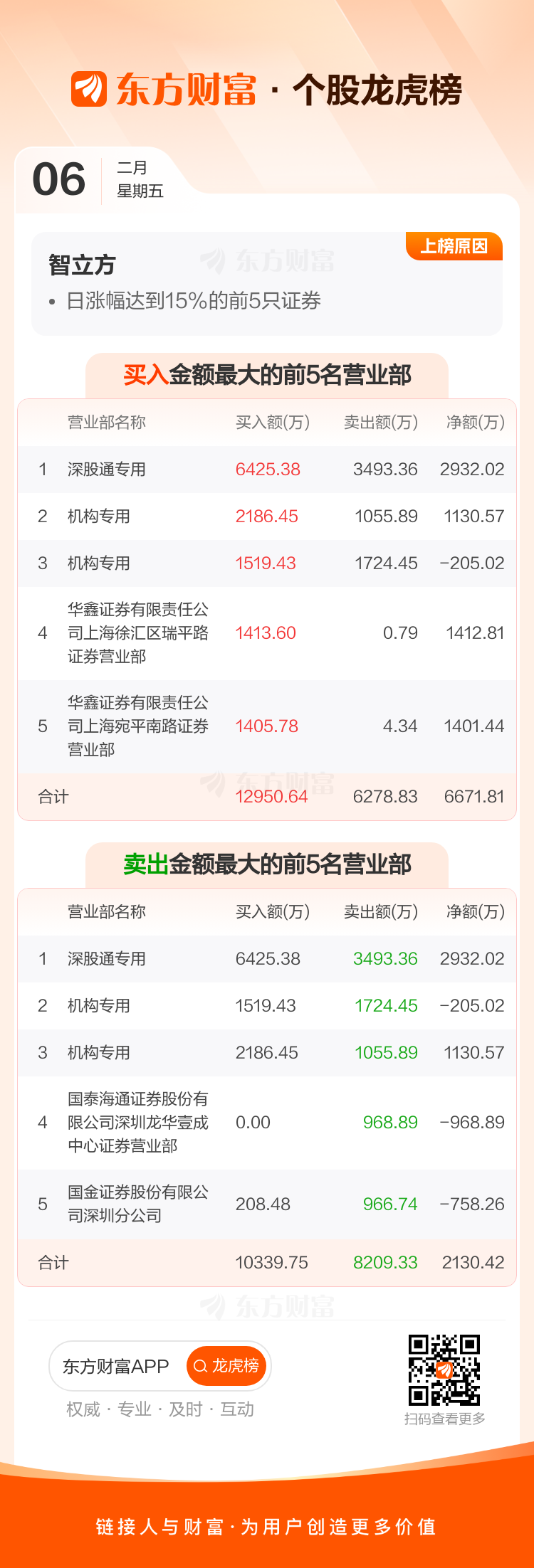 交易所2026年2月6日公布的交易公开信息显示,智立方因成为日涨幅达到15%的前5只证券上榜。智立方当日收报80.33元,涨跌幅20.00%,偏离值20.00%,换手率16.49%,成交额7.39亿。