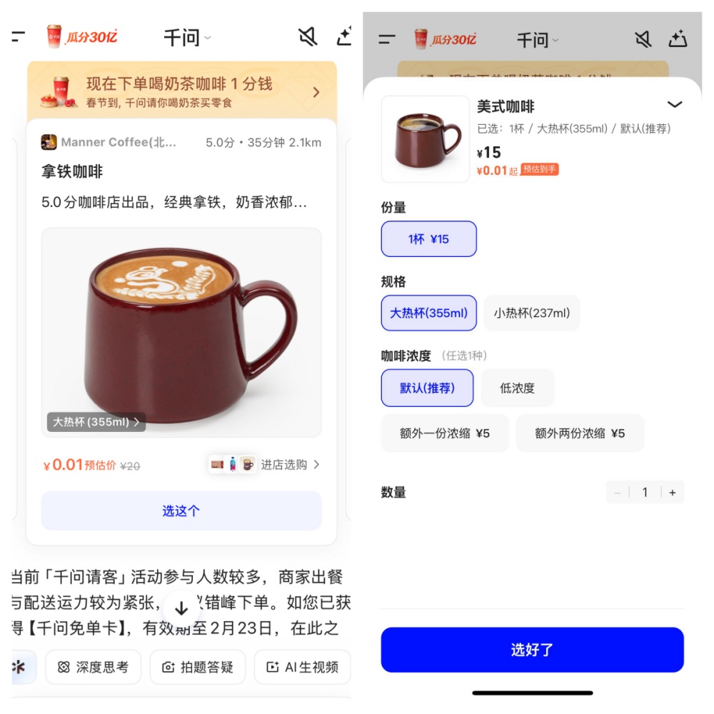 千问此次登顶,核心驱动力源于其力度空前的春节福利活动。2月6日起,用户更新千问APP至最新版,即可免费获得1张25元无门槛免单卡,可在全国30多万家奶茶店使用,涵盖喜茶、奈雪、瑞幸、一点点、古茗等众多知名品牌,部分奶茶商品免单价仅0.01元。