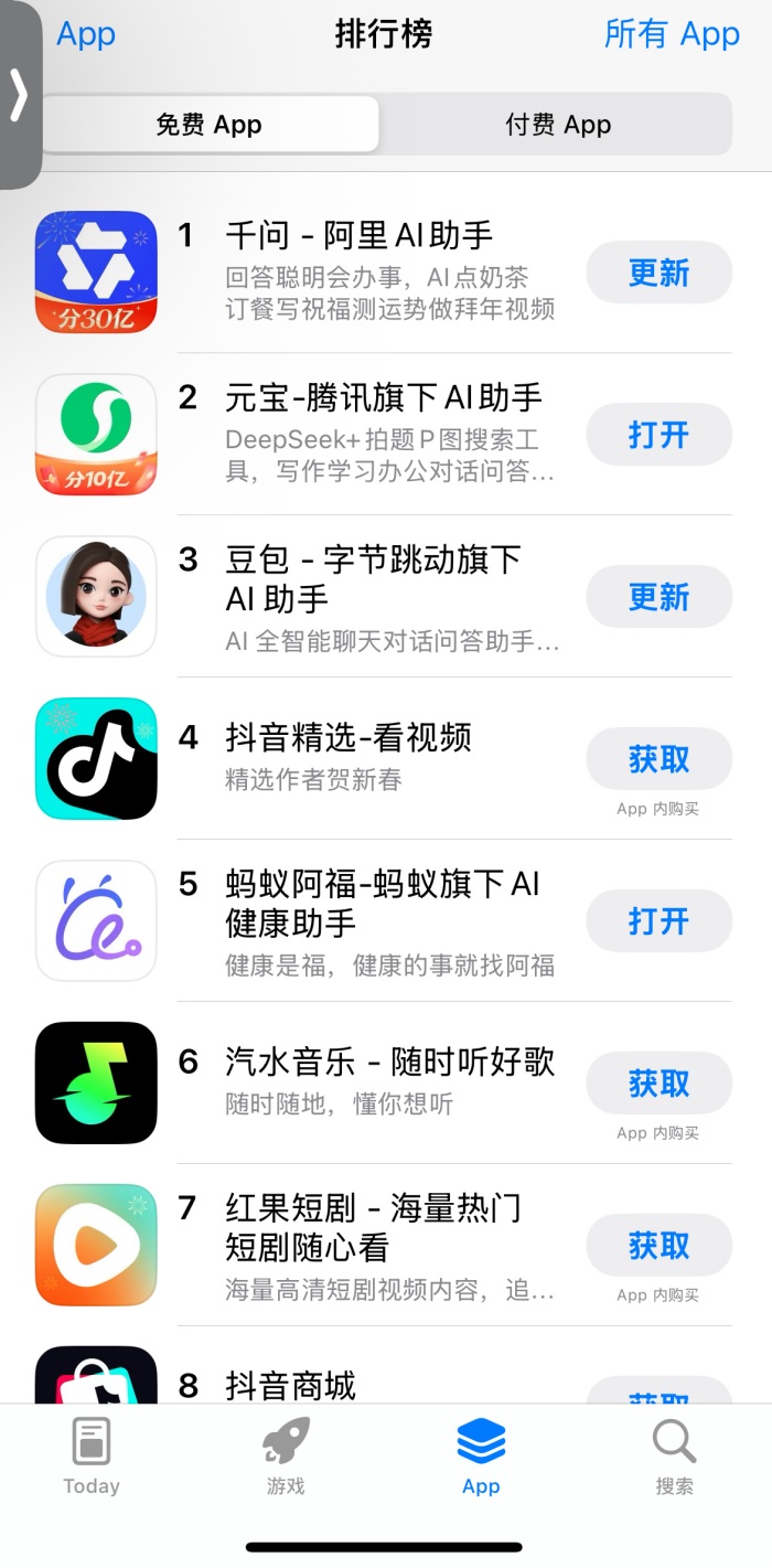 2月6日,阿里千问APP凭借“春节30亿大免单”活动引发用户参与热潮,上线五小时内超500万单奶茶在该APP完成下单,仅用2小时便从苹果App Store免费榜第6名飙升至第1名,成功超越此前占据榜首的元宝APP。