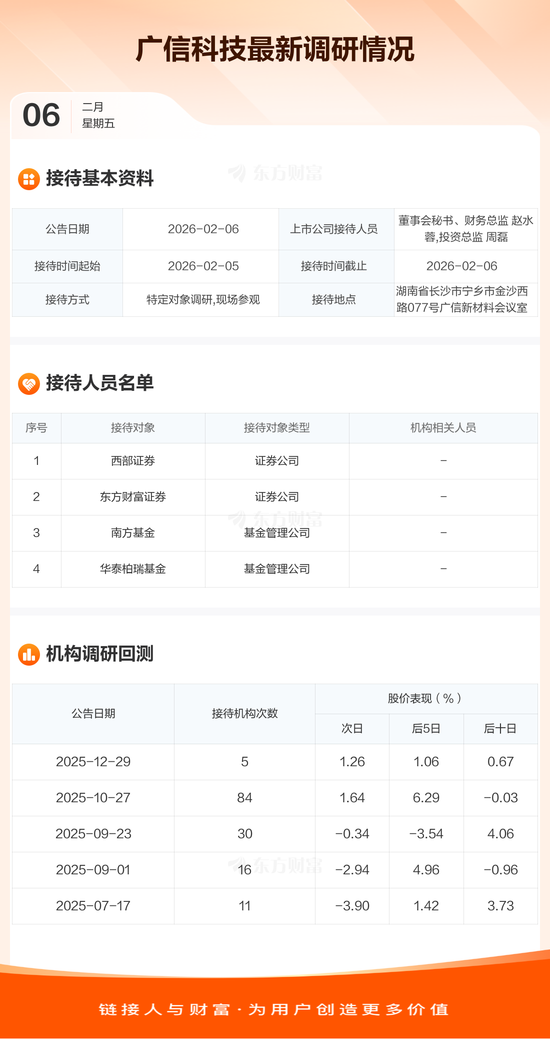 广信科技2月6日公告称,2月5日至2月6日接待西部证券等4家机构调研。接待人员包括董事会秘书、财务总监 赵水蓉,投资总监 周磊。