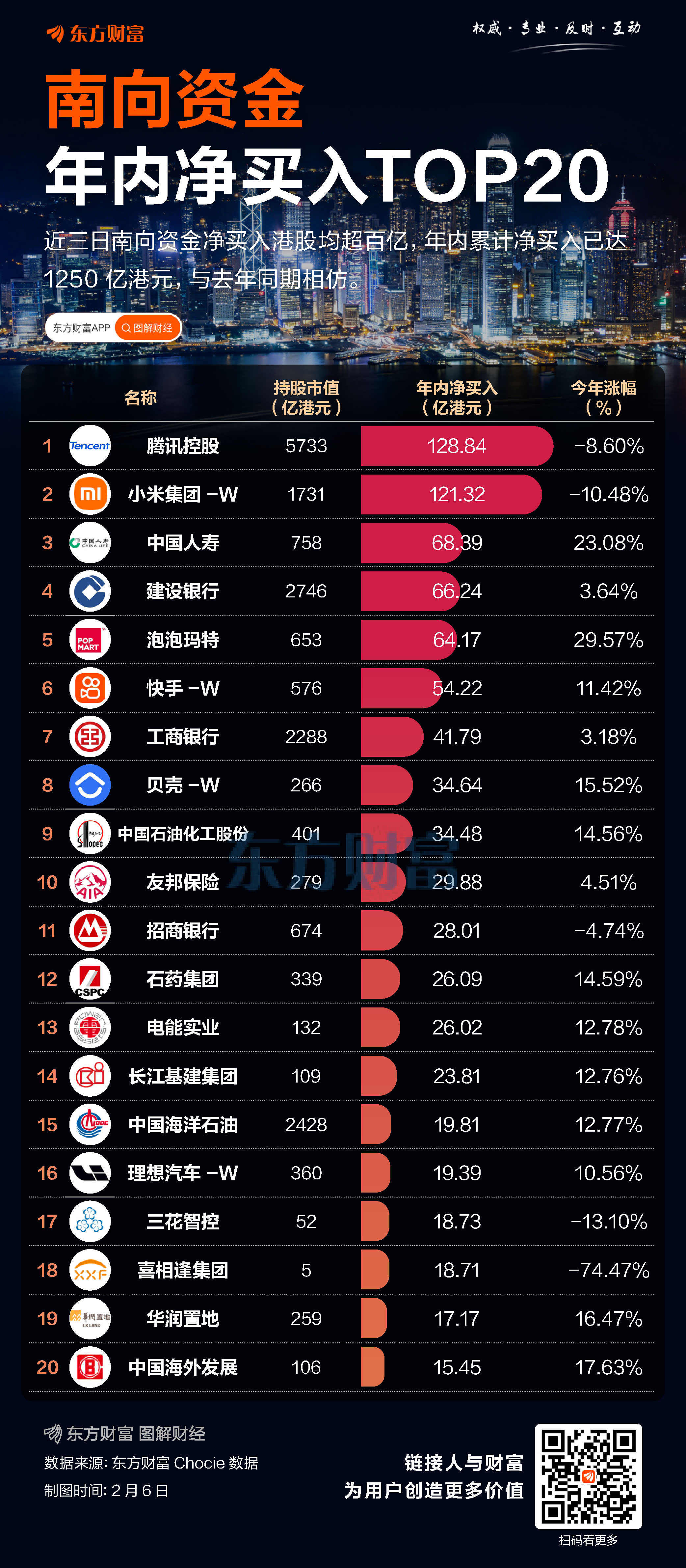 2月6日,恒生指数全天调整收跌1.21%,南向资金净买入148.59亿港元,已是连续第三日净买入超百亿港元。此前的2月4日及2月5日,南向资金分别净买入133.73亿港元、249.77亿港元,近三个交易日累计净买入超500亿港元。