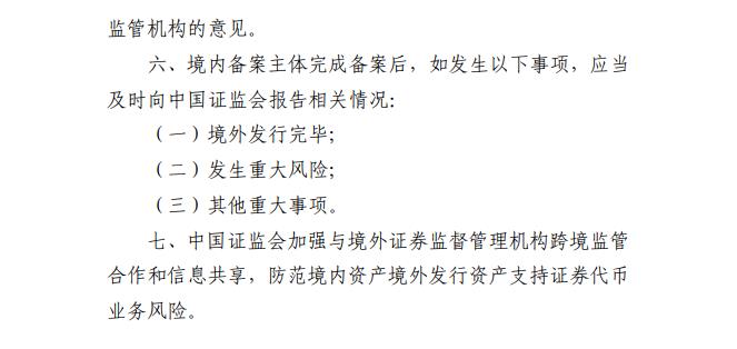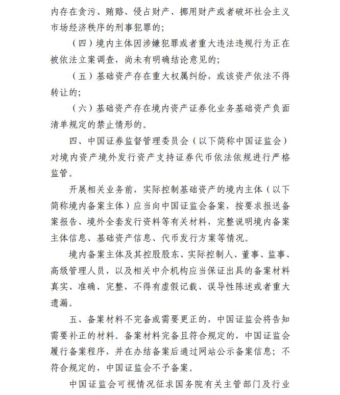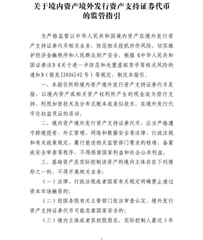 中国证监会2月6日公布《关于境内资产境外发行资产支持证券代币的监管指引》,自公布之日起施行。指引所称境内资产境外发行资产支持证券代币是指,以境内资产或相关资产权利所产生的现金流为偿付支持,利用加密技术及分布式账本或类似技术,在境外发行代币化权益凭证的活动。境内资产境外发行资产支持证券代币,应当严格遵守跨境投资、外汇管理、网络和数据安全等法律、行政法规和有关政策规定,履行前述相关监管部门要求的核准、备案或安全审查等程序,不得损害国家利益和社会公共利益。