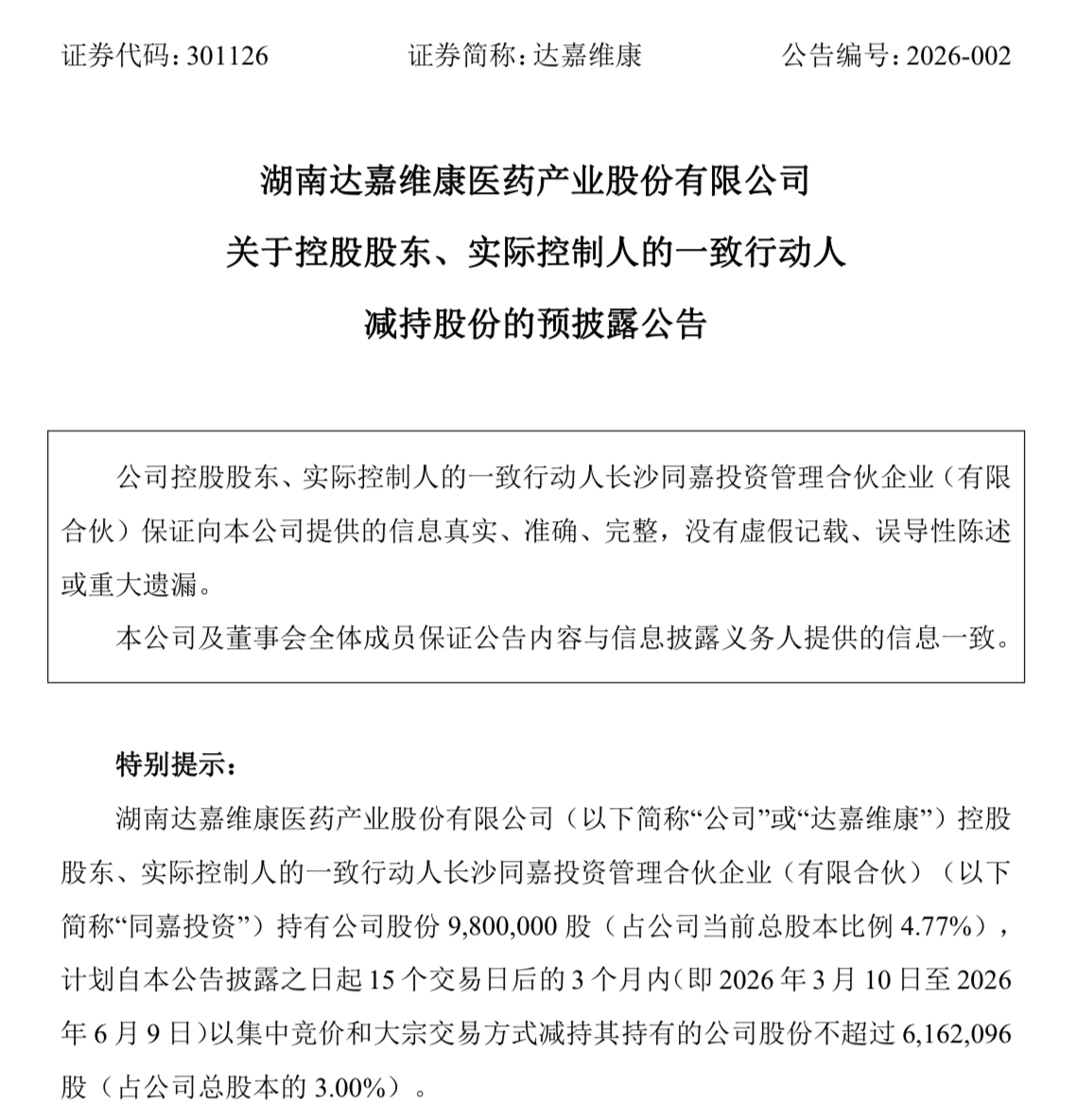 达嘉维康2月6日晚间发布公告称,湖南达嘉维康医药产业股份有限公司控股股东、实际控制人的一致行动人长沙同嘉投资管理合伙企业(有限合伙)持有公司股份980万股(占公司当前总股本比例为4.77%),计划自本公告披露之日起15个交易日后的3个月内(即2026年3月10日至2026年6月9日)以集中竞价和大宗交易方式减持其持有的公司股份不超过约616万股(占公司总股本的3%)。