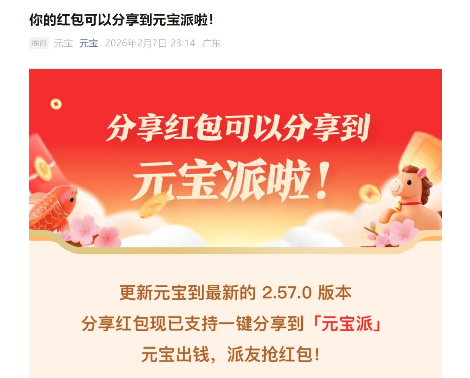 每经AI快讯,2月7日深夜,腾讯元宝官微发布消息称,更新元宝到最新的2.57.0版本,分享红包现已支持一键分享到「元宝派」。