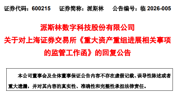 2月6日晚,派斯林(600215)发布公告,就上交所下发的关于公司重大资产重组进展相关事项的监管工作函进行全面核实和回复。派斯林回函表示,交易对手方长春经开国资控股集团有限公司(以下简称“国控集团”)未能按约支付第三期股权转让款剩余1.72亿元构成违约,应承担违约责任并继续履约,且违反承诺未按照承诺时间付款,损害了上市公司利益。