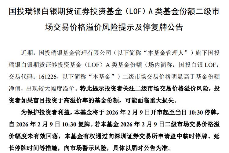 2月8日,国投白银LOF公告称,近期其二级市场交易价格明显高于基金份额净值,溢价幅度较大。为保护投资者利益,基金将于2026年2月9日开市起至10:30停牌,10:30复牌。若当日溢价幅度未有效回落,基金有权采取进一步措施。自2026年1月28日起,基金已暂停申购(含定期定额投资)业务,恢复时间另行公告。目前基金运作正常,无应披露未披露重大信息。