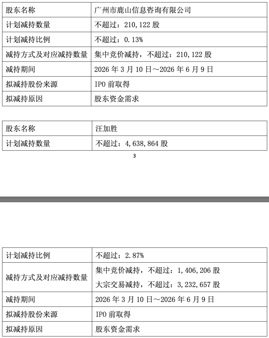股东鹿山信息、汪加胜因资金需求,计划自本减持计划公告之日起15个交易日后的3个月内,拟通过集中竞价和大宗交易方式减持所持有的公司股票,合计减持数量不超过4,848,986股,即不超过公司总股本的3%。
