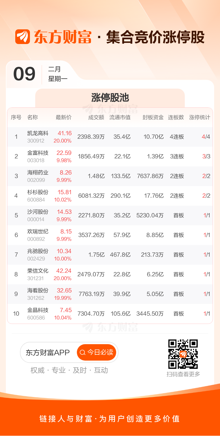 2月9日集合竞价:凯龙高科4连板 金富科技3连板