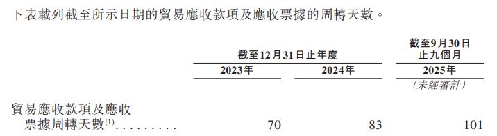 同时,公司的贸易应收款项及应收票据周转天数持续上升,从2023年的70天增加至2024年的83天,并进一步延长至2025年前三季度的101天。这意味着资金被占用的时间变长,增加了坏账风险和流动性压力。