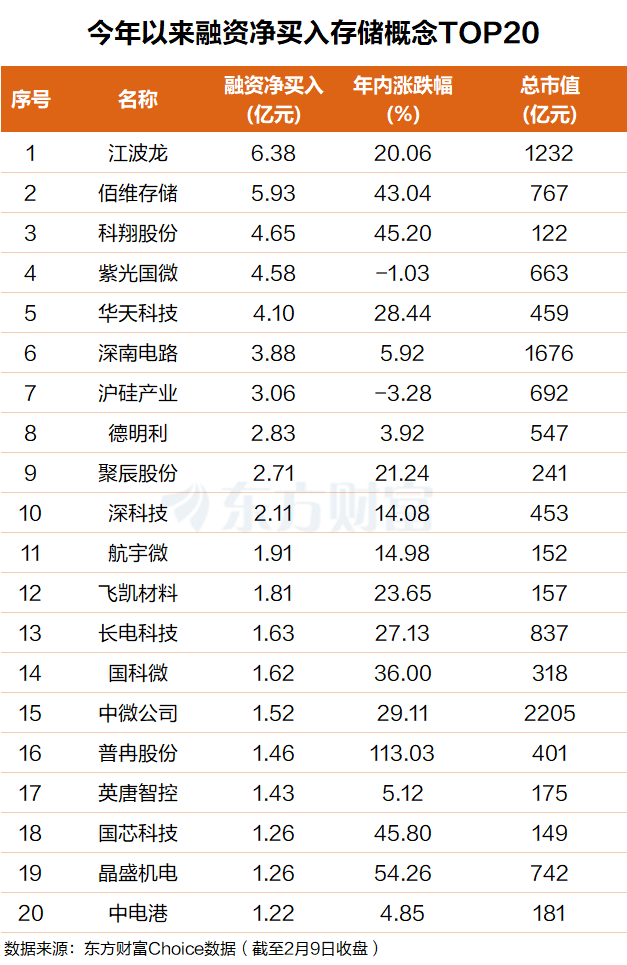 东方财富Choice数据显示,今年以来,杠杆资金抢筹了一批存储概念股,其中江波龙排名第一,融资净买入超6亿元;佰维存储排名第二,融资净买入近6亿元。