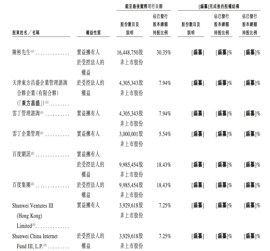 IPO前股权结构显示,陈彬通过直接及间接持股合计控制30.35%股权,为公司实际控制人;百度集团合计持股18.43%,为最大外部投资方;顺为资本持股7.25%,海纳华持股6.49%,中关村科学城持股5.71%。