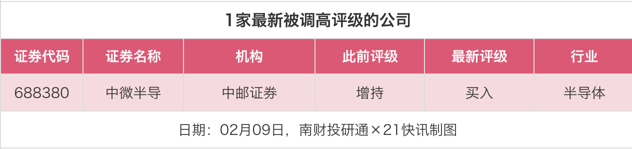 评级调高方面,2月9日,券商调高上市公司评级1家次,最新数据包括了中邮证券对中微半导的评级从“增持”调高至“买入”。