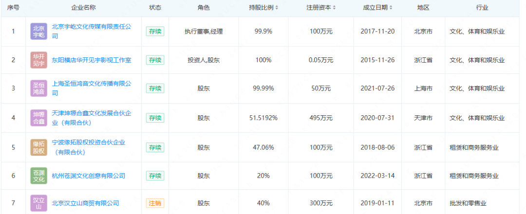 企查查显示,华晨宇直接控股6家企业,在北京宇屹文化传媒有限责任公司、东阳横店华开见宇影视工作室担任法定代表人,覆盖文化、体育、娱乐、租赁和商务服务业。上述企业注册资本多在百万元以上。