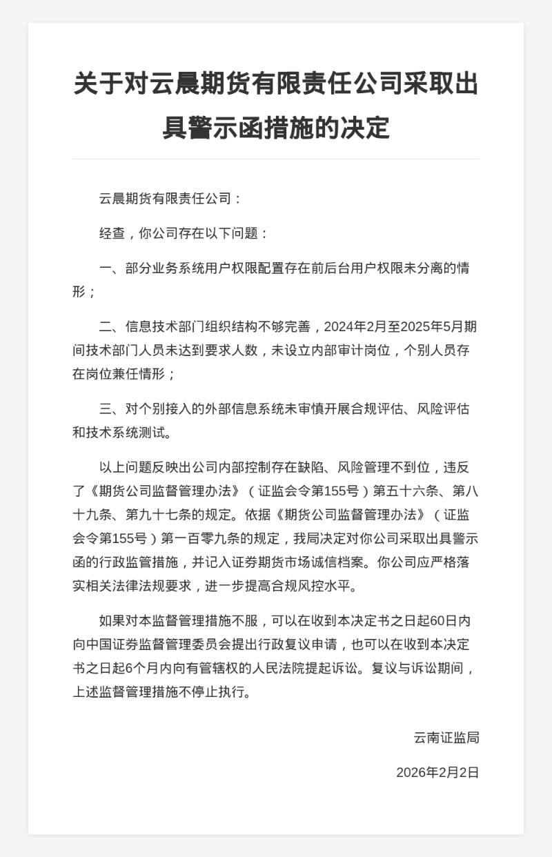 云晨期货被出具警示函,涉内控缺陷与风控不足